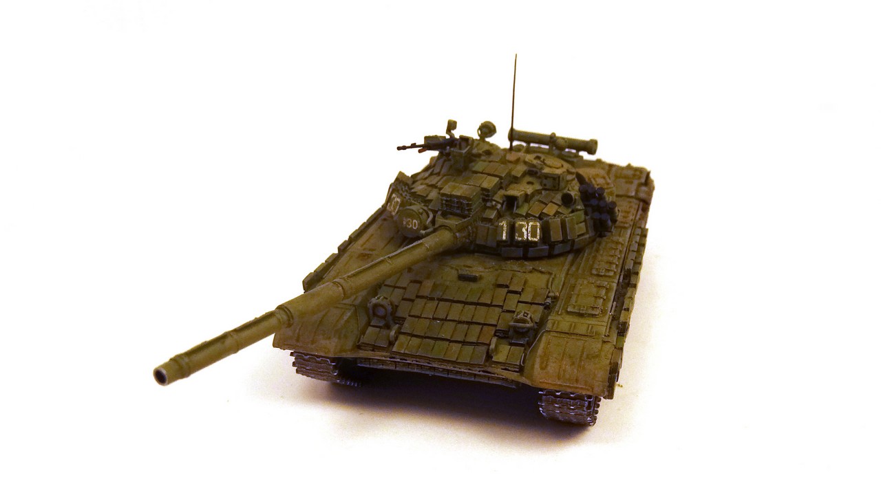 Ну вот и подошла к финалу постройка модели танка из семейства Т-72 по принципу "Не-как-у всех". В данном случае это стал танк ВС Украины Т-72Б1 с известной фотографии, обычно подписанной "Т-72Б ВС Украины в учебном центре "Десна", 2011 г.". Т-72Б1 "Белый 130". Однотонный зелёный. Чёрные резинотканевые экраны. Белые номера.