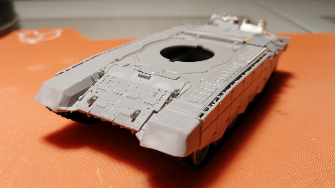 3. Внимательнее посмотрите на фотографии ВЛД Т-72Б3 обр. 2016 г. и «прилегающее»: убрать надбой у люка мех-водителя, ребра жесткости на крыльях… Вообще в этом смысле корпус Т-90МС гораздо интереснее, но там надо срезать дополнительную защиту крыши в передней части, ВСУ на корме… Со своим специнструментом из скальпеля и шкурки я не смог это аккуратно сделать. Потому остановился на таком варианте.