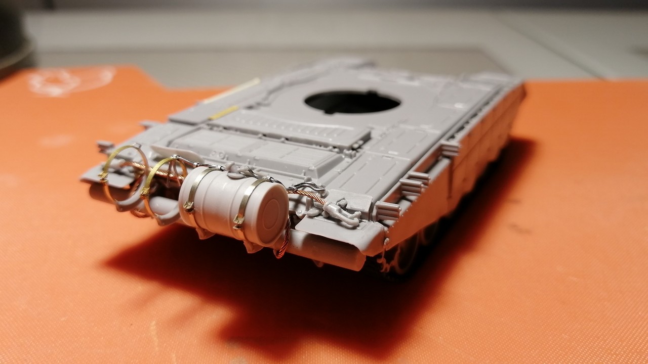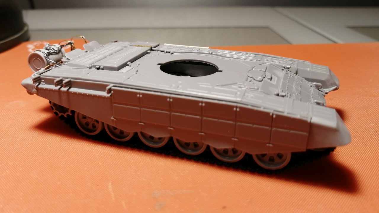 Итак, сложив всё в коробочку и традиционно немного «потряся» на выходе получили неплохую пластиковую «болванку» корпуса Т-72Б3 с улучшенными боевыми характеристиками. Впереди – немного обсыпать ФТД и смолой из антикризисных проектов для Т-90. На корму уже поставил топливную бочку и тросы. Лом на борту, крепления под трал на ВЛД тоже сделаны.