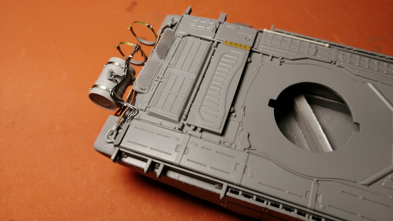 В любом случае с юбкой-мини всё смотрелось неплохо. В моём же случае был вариант юбки-макси. И по фотографиям ступицы катков практически скрывались экранами. Пришлось сточить верхний край «ванны» корпуса 5020 на этот самый миллиметр – полтора. Сразу потребовалось дорабатывать кормовую плиту. По-большому, с чистой совестью можно ставить эту деталь от Т-90МС: она как раз получилось именно таких размеров после стачивания. Повезло… Но я использовал от 5020, срезав сверху. Мелочь на неё – также от 5020. Вообще надо сказать, что в 5065 сделали неплохую работу над ошибками по корпусу! Масса отличных мелких деталей на корму – и смола с ФТД не нужна.