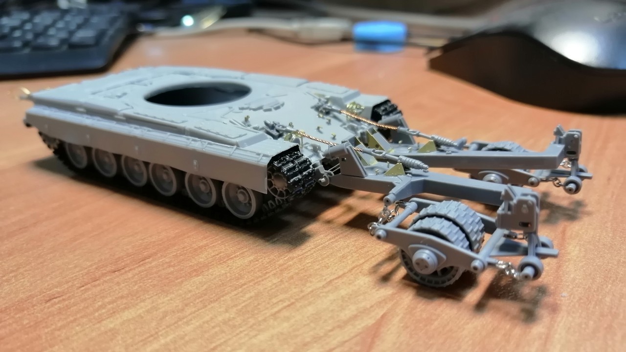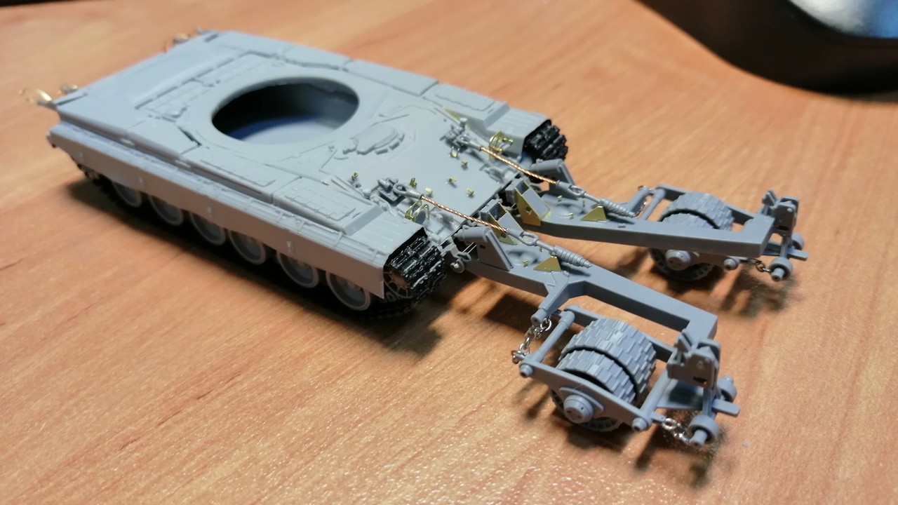 К слову про трал - КМТ-7 от от Snake Models: несмотря на все огрехи, забытые детали и спорность технических решений, мне понравился результат! И, пожалуй, возьму ещё один. Подвижность конструкции позволяет сделать "агрегат" в разных положениях. Потому поставлю на один из следующих Т-72Б/Б3.