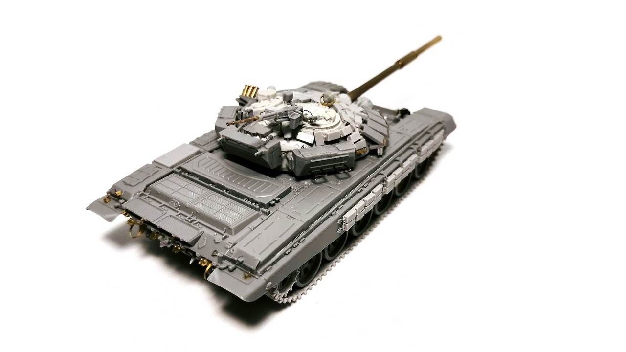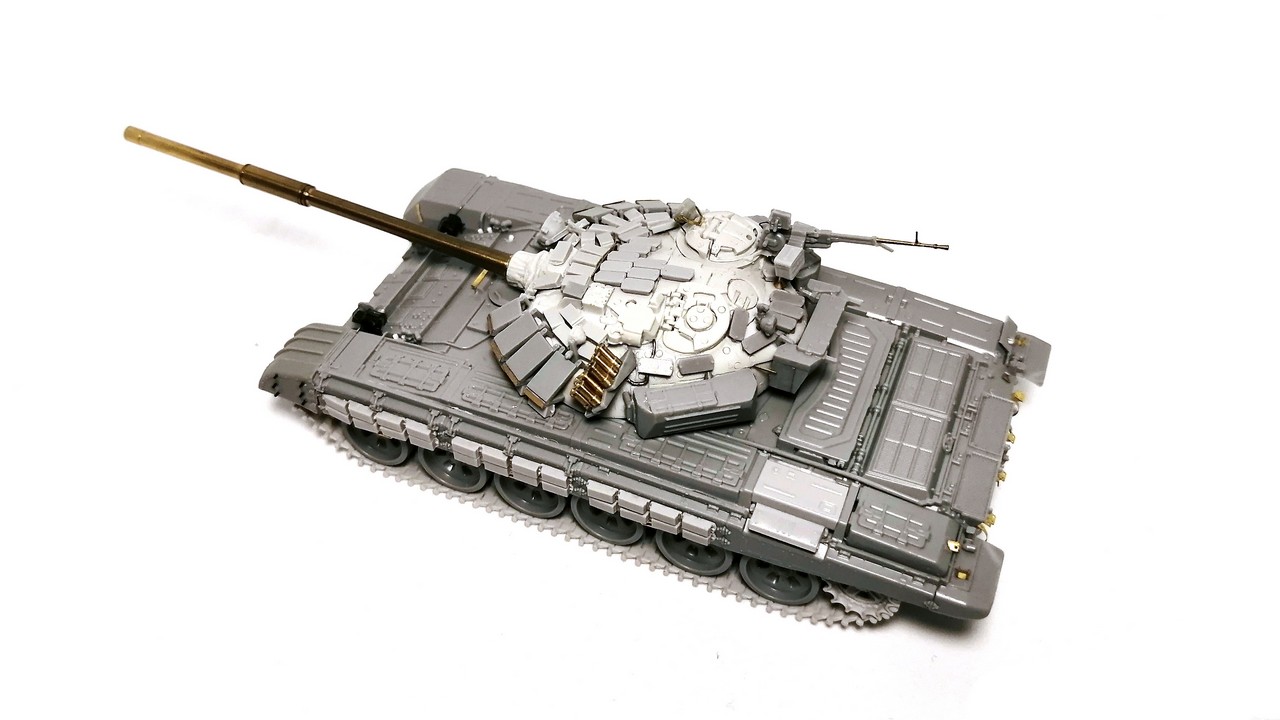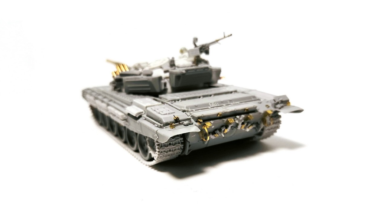 Согласно выбранному прототипу внёс кое-какие изменения/дополнения по корпусу: левый передний брызговик заменил на ранний тип от Т-72Б с узлами крепления блоков ДЗ «Контакт-1» на боку; нестандартно установленные блоки ДЗ «Контакт-1» на бортовых экранах.