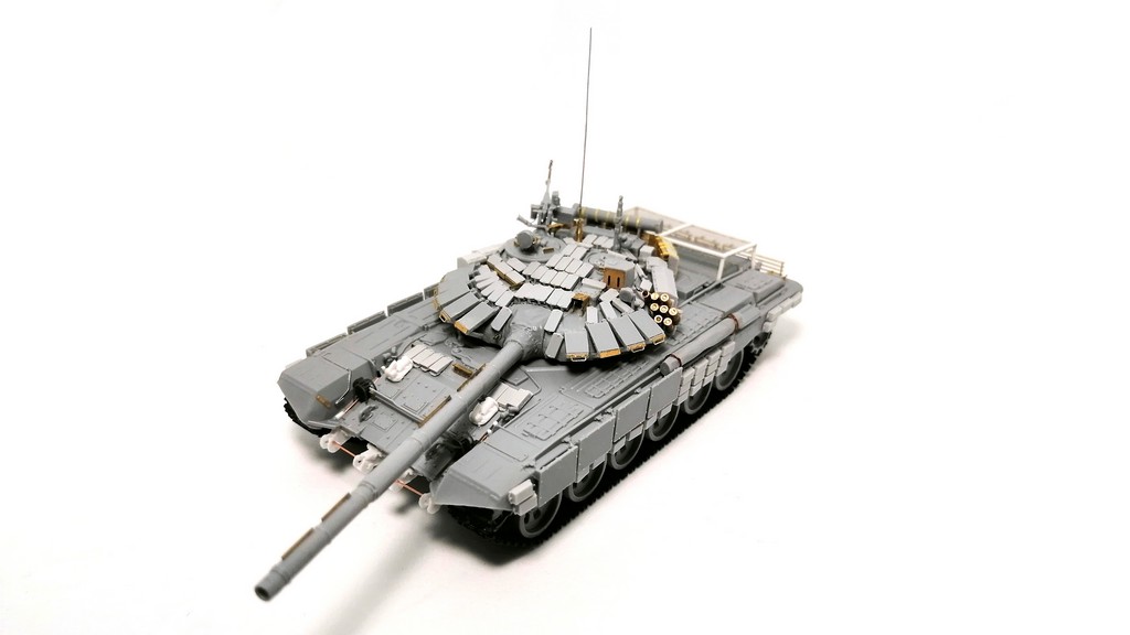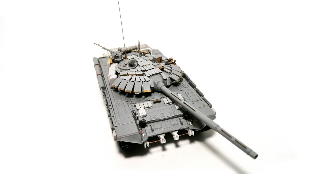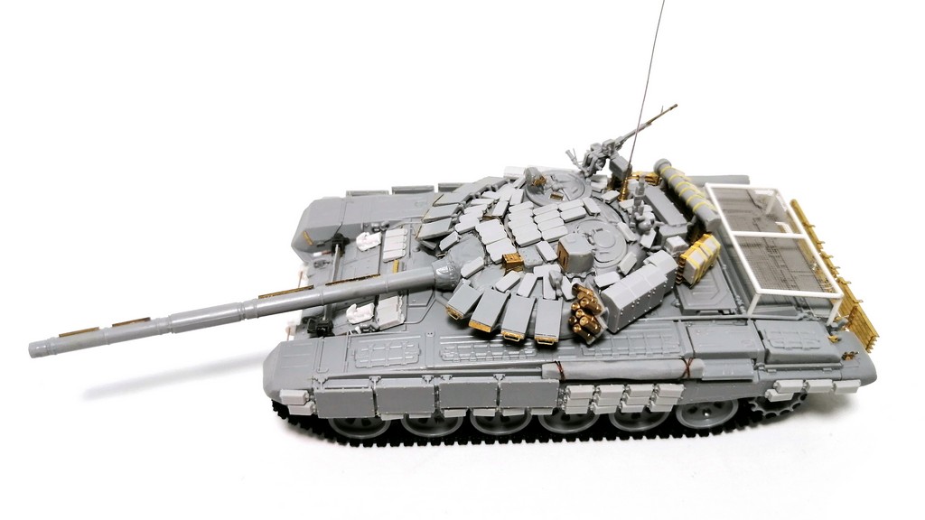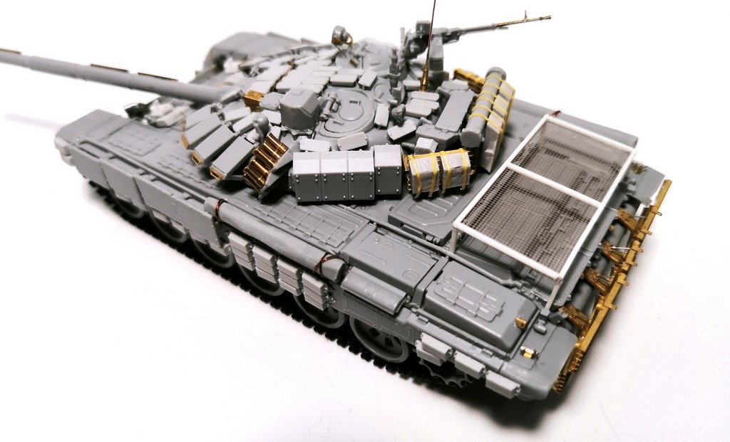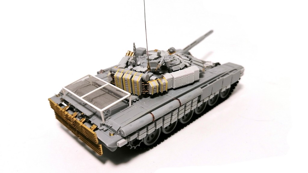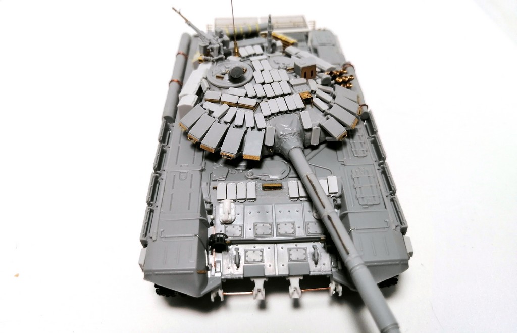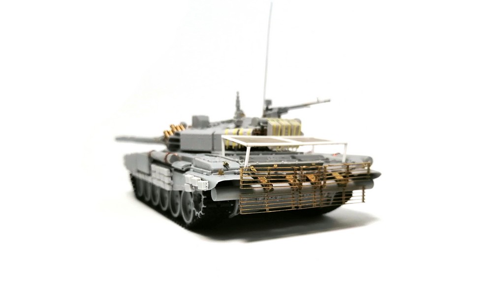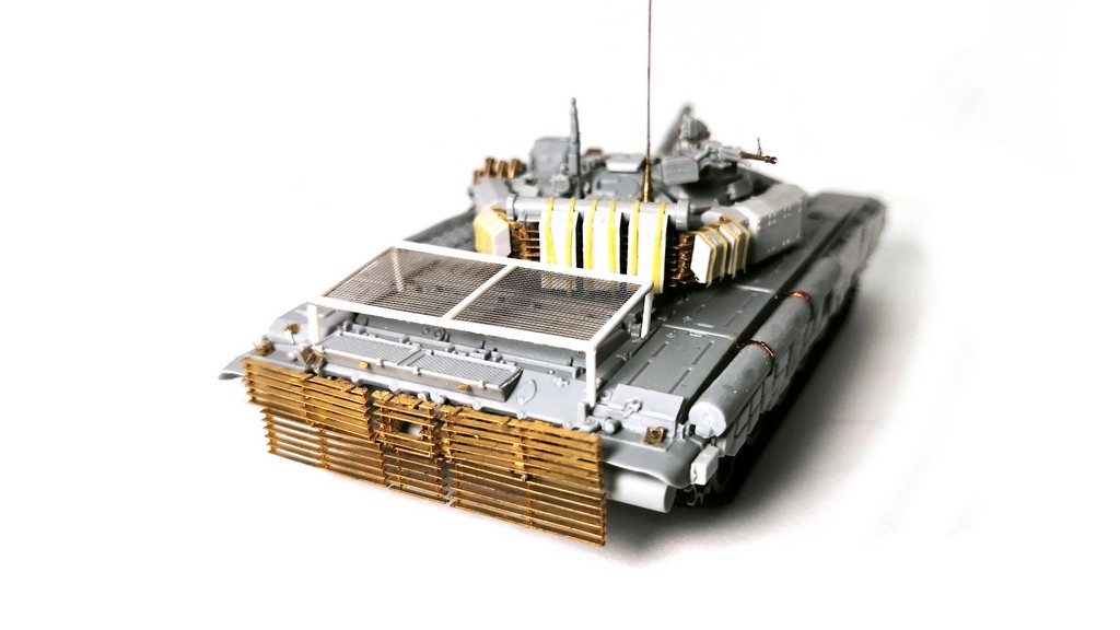 Вместо ящиков ЗИП на бортах башни – блоки ДЗ от Ogurets Projekt. На корму башни – решётки от SG-Modelling. Поверх решёток закреплена «ДЗ в мягком корпусе» от «Танкограда» (ну или от SG-Modelling сейчас). Небольшое количество блоков ДЗ «Контакт-5» на крыше башни Б3 обр. 2011/2016 г. естественно вызывает у экипажа перекрыть все уязвимые зоны! Для этого в дело пошли блоки «Контакт-5» от «Огурца». Схемой размещения послужили фотографии с фронта!
