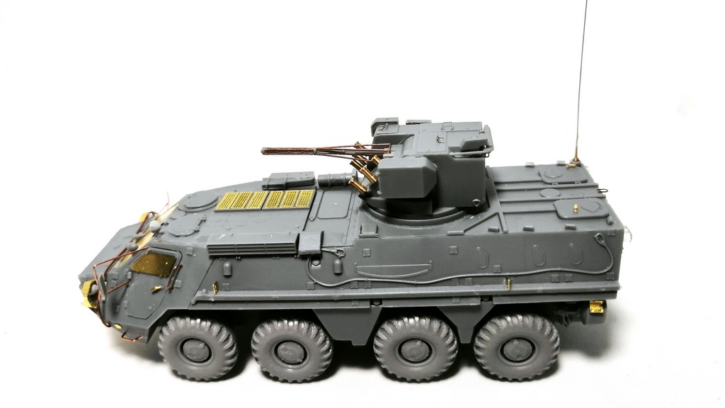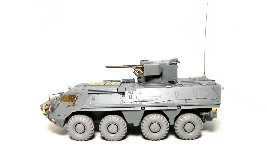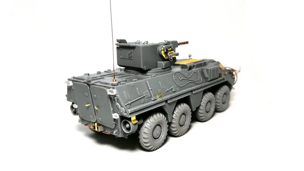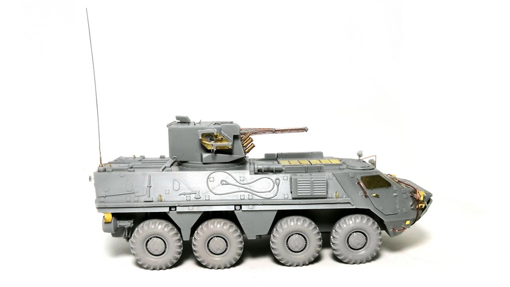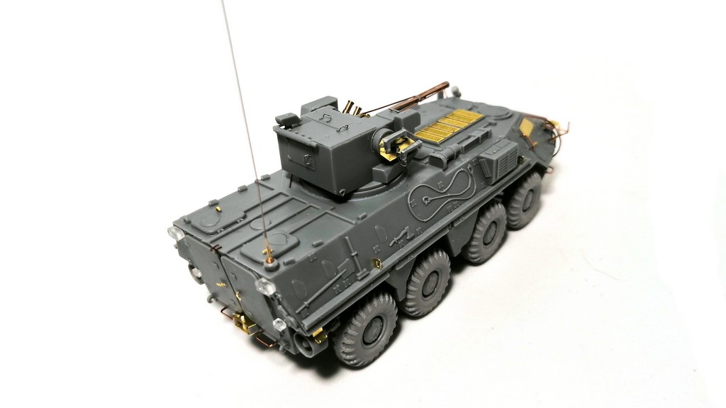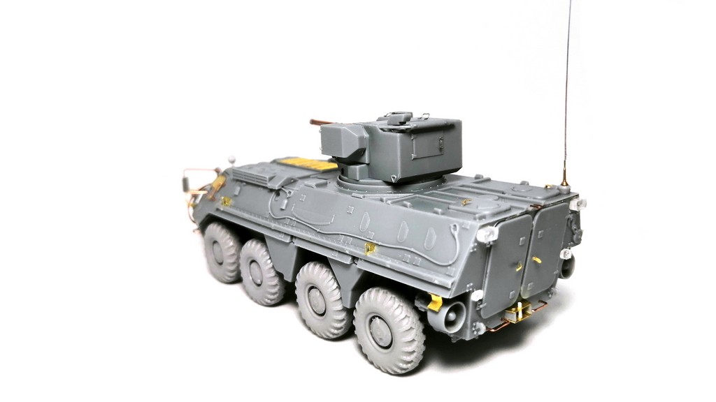 Сама модель приятна в работе, хотя избалованность многоразьёмными китайскими прессформами сказывается: свод всех поверхностей бронекороба занятие не простое. Шпаклёвка требуется! Ну и немного бесит размещение всего ЗИП на деталях бронестенок! Без инструмента от этого не избавишься. На БТР-4Е его много, вокруг всех этик тросов, молотков и пил (которые по уму надо бы сточить в 0) много «нужных» элементов (бойницы, узлы крепления экранов и прочего). Тут я всё оставил. Потренируюсь в срезании на семействе Тигр-М от RPG!