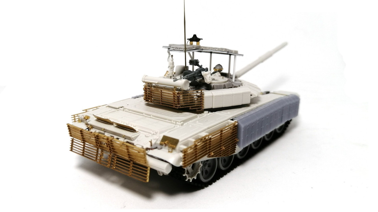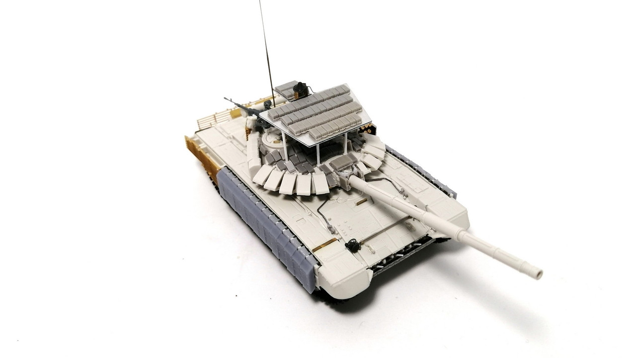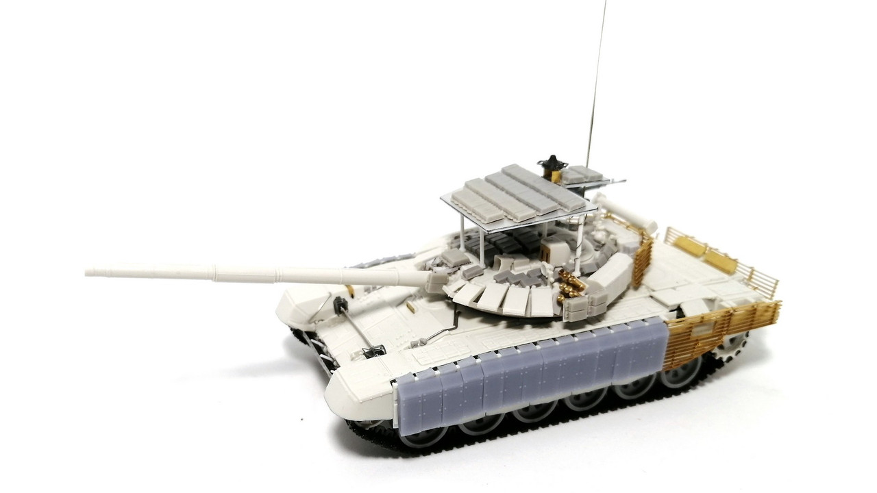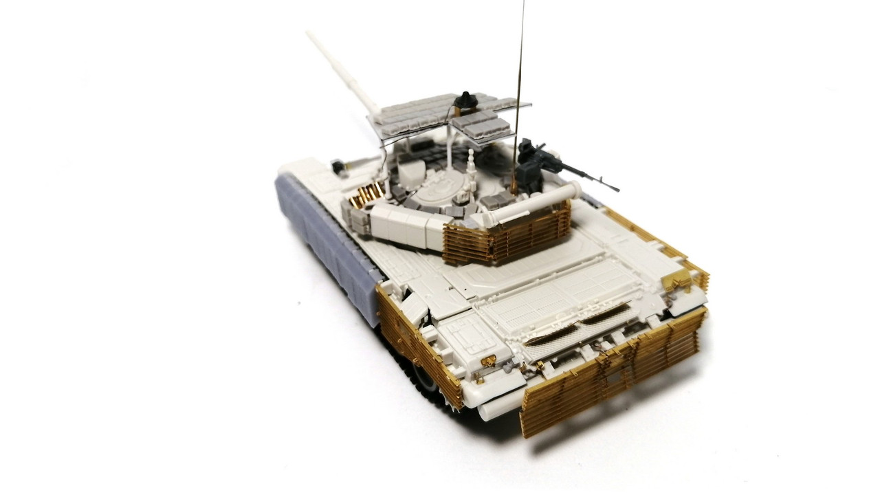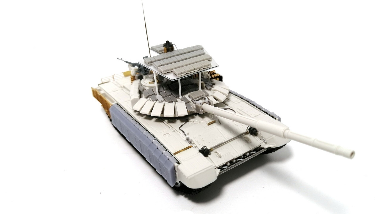 А вот башня стала уже по проекту обр. 2022 г. С усиленным бронированием за счёт использования блоком «Контакт-1». Но ещё с решетчатыми экранами на корме! Блоки – от SG-Modelling. Гранатомёты для «Тучи» - Zedval. Командирский прожектор – SG Modelling. Пулемёт – от SSModel.
